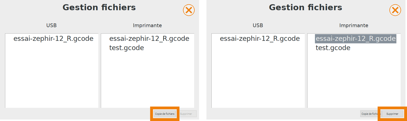 Cette fenêtre permet de gérer les fichiers .gcode de l’imprimante et de la clé USB.