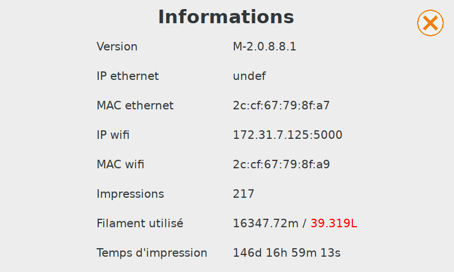 Cette fenêtre renvoie diverses informations sur l’imprimante 3D : numéro de série, version de l’interface, nombre d’impressions effectuées, etc.