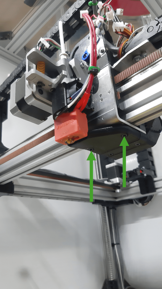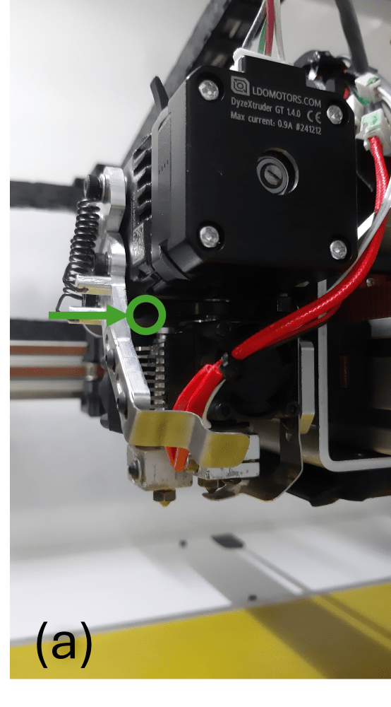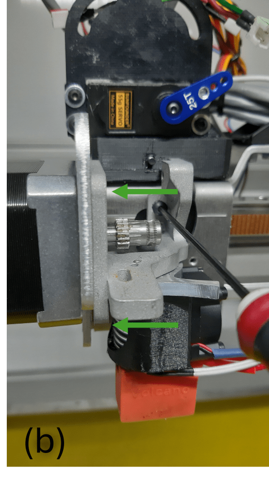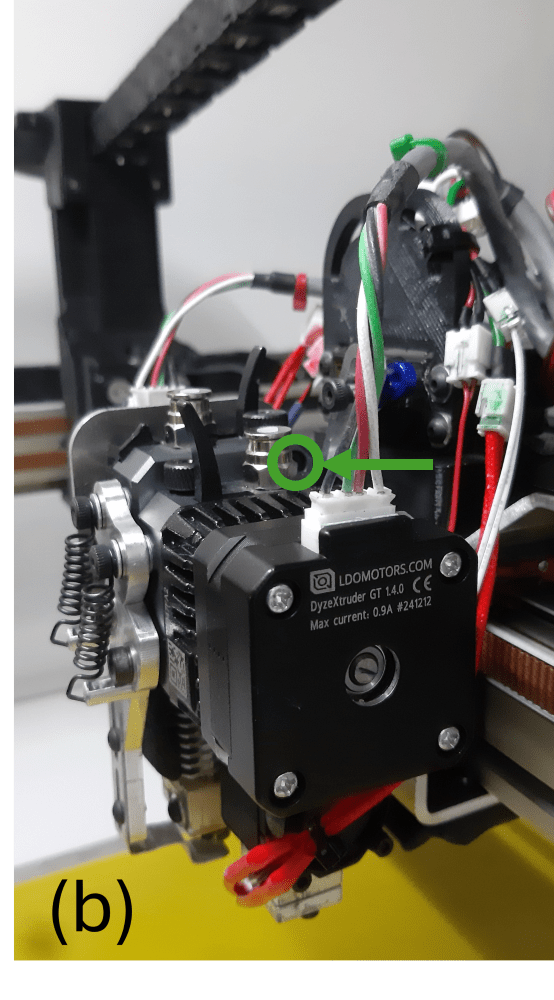 Amener manuellement T1 en position basse (attention à l’écart buse / plateau) pour dévisser la 2ème vis de fixation (b). Maintenez le moteur et l’extrudeur, afin qu’ils ne tombent pas sur le plateau !