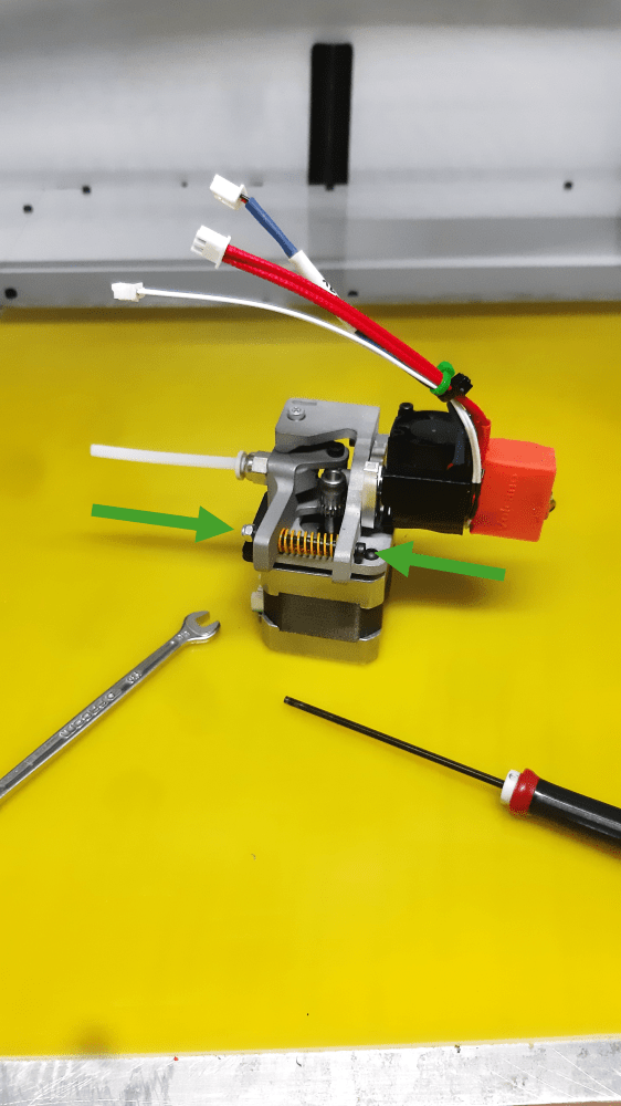 Retirez la vis et le ressort du levier de l’extrudeur (clé allen 2,5 mm et clé plate 5,5 mm), puis retirez complètement le levier (clé allen 2,5 mm).