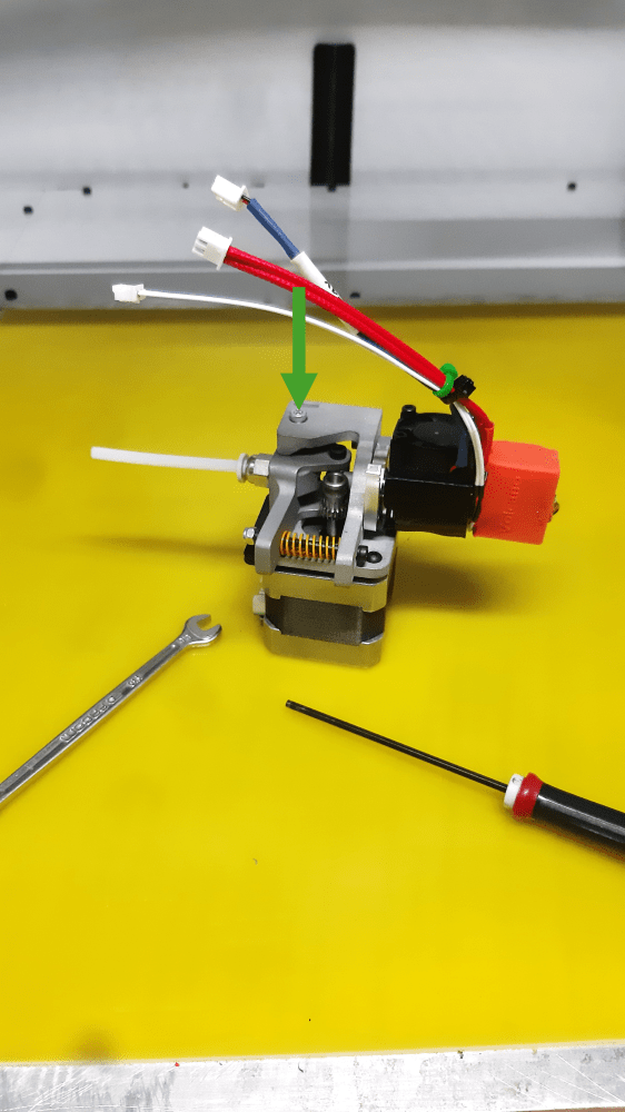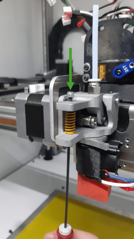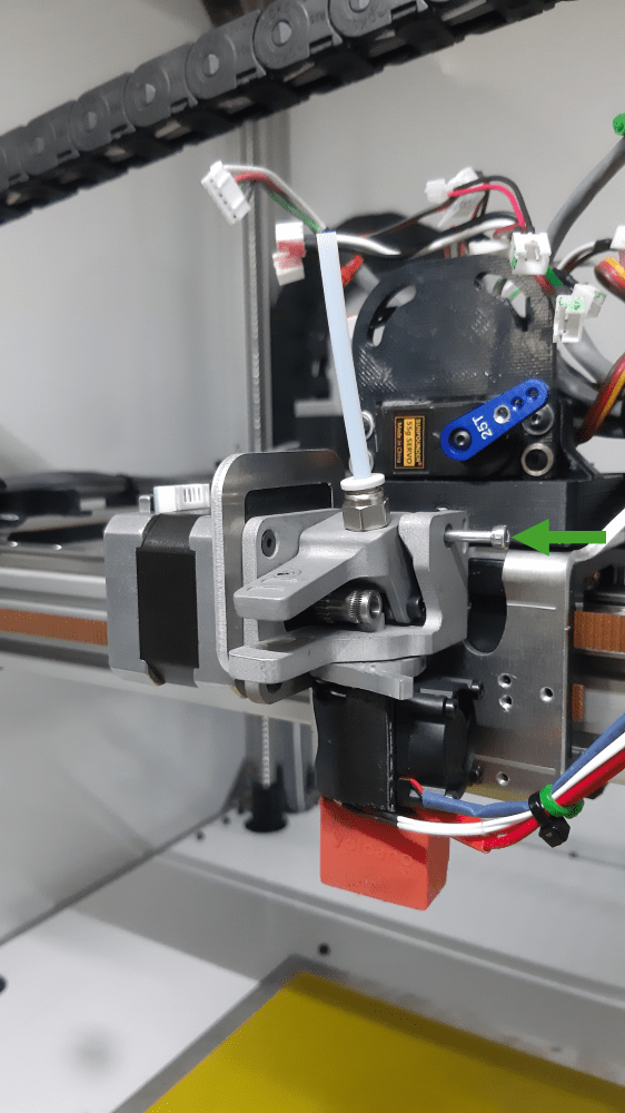 A l’aide d’un tournevis hexagonal de 2.0 mm, retirez la vis qui maintient le fût situé sous l’extrudeur : il est possible que le fût tombe de lui-même ; si le fût reste en place, débrayez le système d’entrainement pour insérez un morceau de filament depuis l’entrée de l’extrudeur et poussez-le manuellement jusqu’à faire sortir le fût.