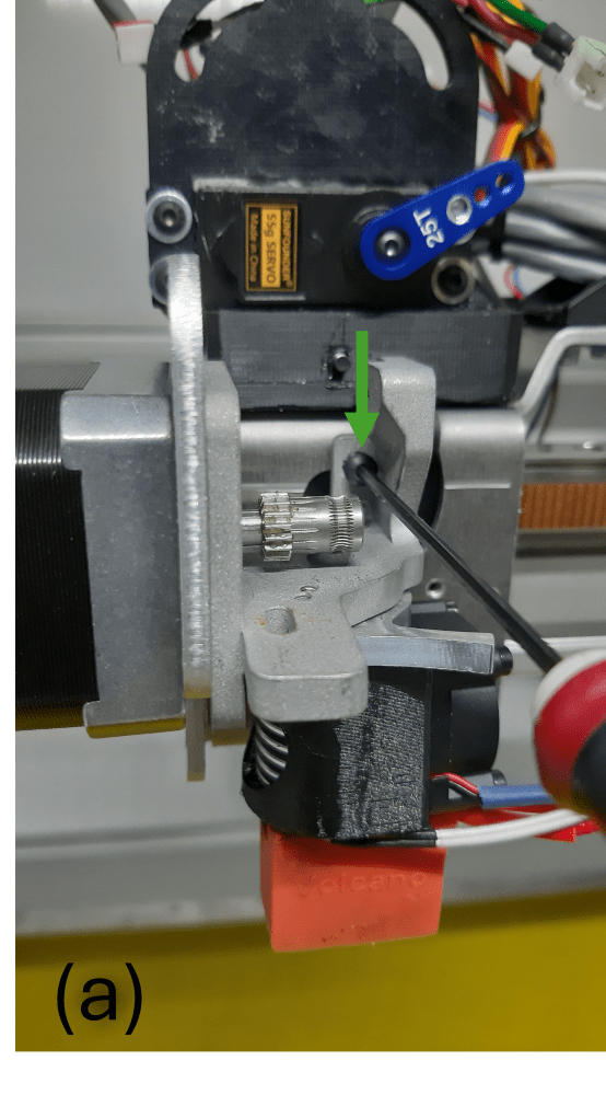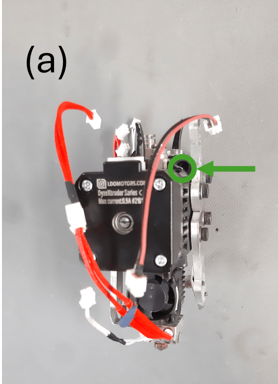Desserrez légèrement la vis sans tête qui maintient le pignon d’entrainement sur l’arbre du moteur de l’extrudeur : le pignon doit coulisser sans pivoter totalement ; plaquez le pignon contre le moteur.