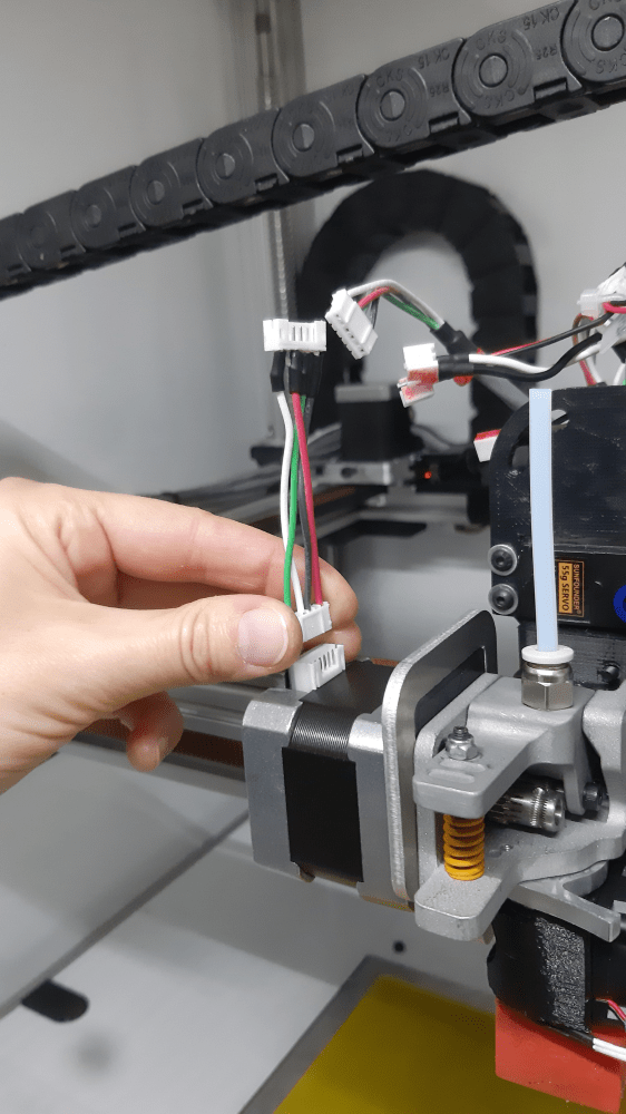 Débranchez le connecteur du moteur d’entrainement : câbles fins 4 couleurs, petit connecteur 4 pins.
