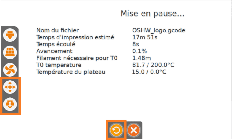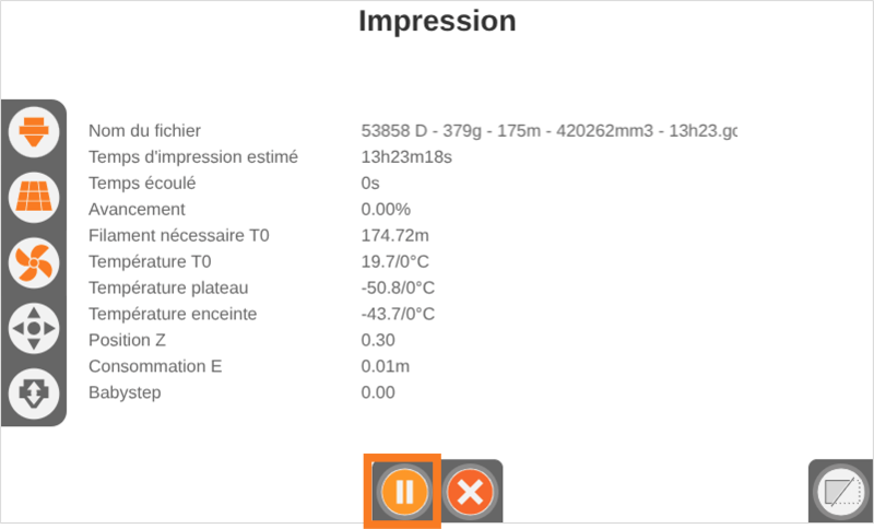Les températures de la tête d’impression et du plateau sont maintenues le temps de la pause. Il est conseillé de sortir de la pause le plus rapidement possible pour éviter de dégrader la matière dans la buse et de créer un bouchon (anticiper les fins de filament et les commandes de pause insérées dans le fichier .gcode).