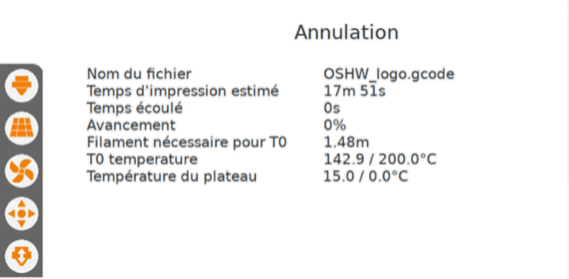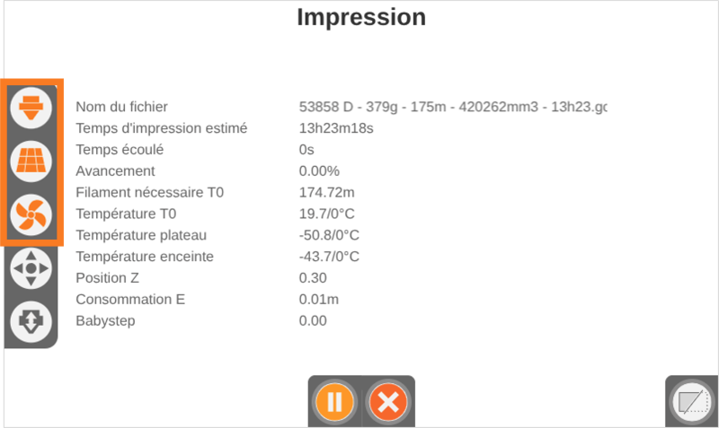 Ces paramètres modifiés manuellement seront appliqués tant qu’aucune nouvelle instruction du fichier .gcode en cours d’impression ne vient les écraser.
