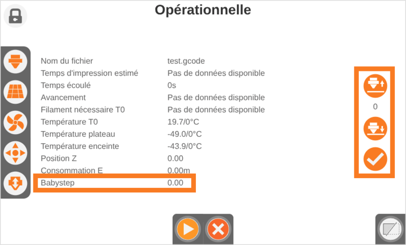 sur l’icône (V) ; la valeur cumulée des ajustements est rappelée sur la ligne Babystep de la fenêtre d’impression.