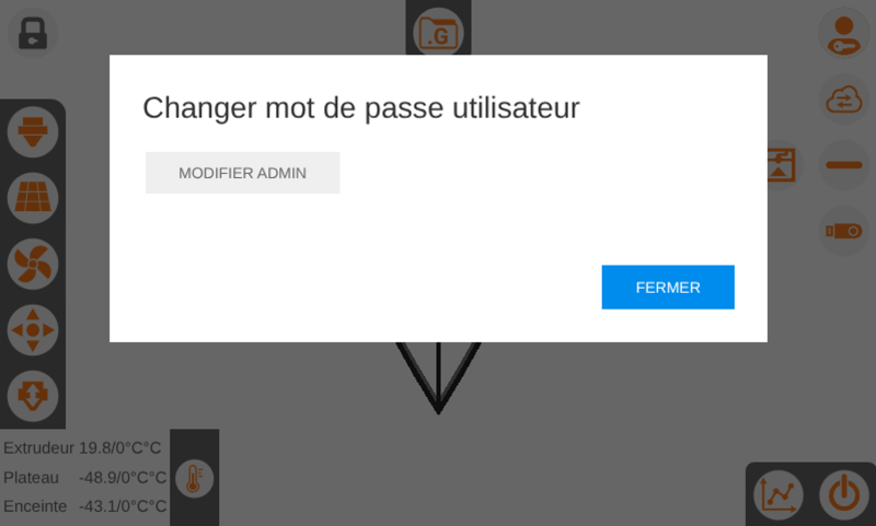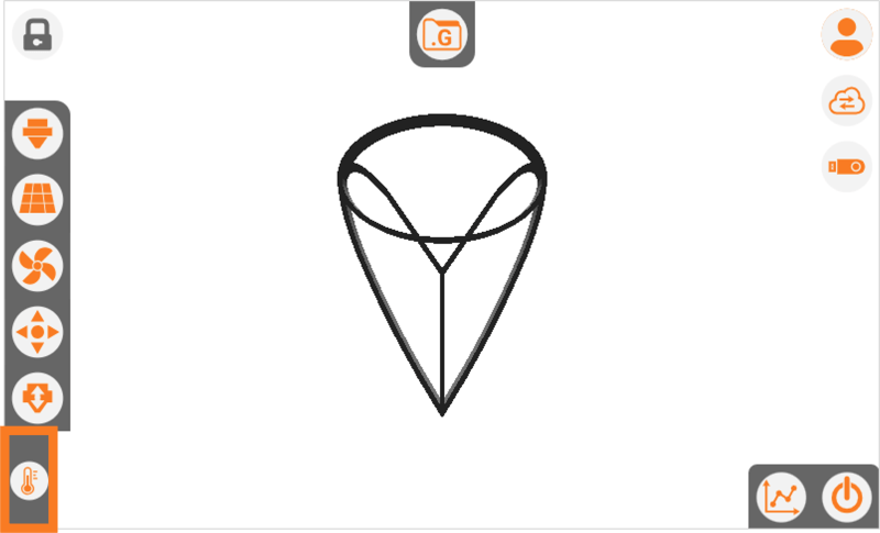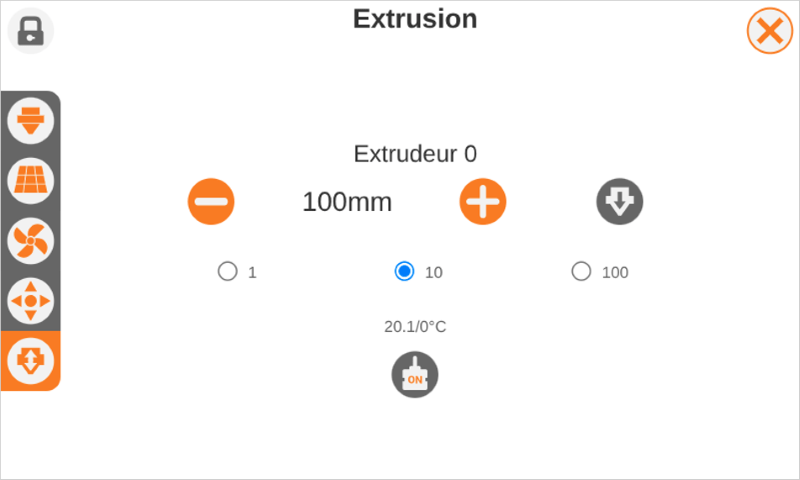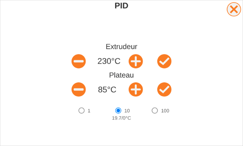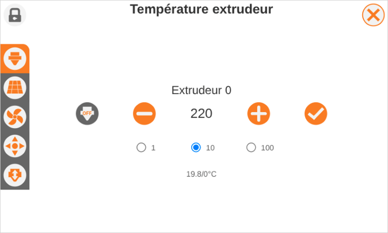 L’icône (X) ferme la fenêtre de contrôle de la température de l’extrudeur, en conservant la dernière température consigne.