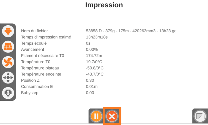 Il est possible d’annuler/arrêter une impression en appuyant sur l’icône (X). L’imprimante finit d’exécuter les commandes en mémoire et s’arrête au bout de quelques instants ; la tête se déplace afin de libérer le volume d’impression. Les éléments mobiles et chauffants ne sont plus alimentés.