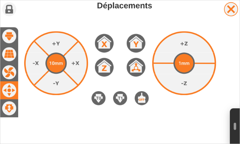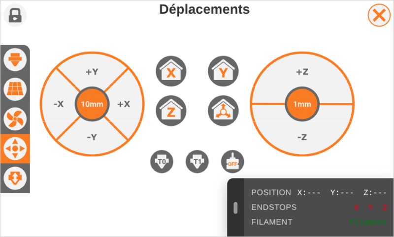 Cette fenêtre permet le déplacement des éléments mobiles en X ; Y et Z (tête d’impression et/ou plateau selon la configuration de l’imprimante 3D).