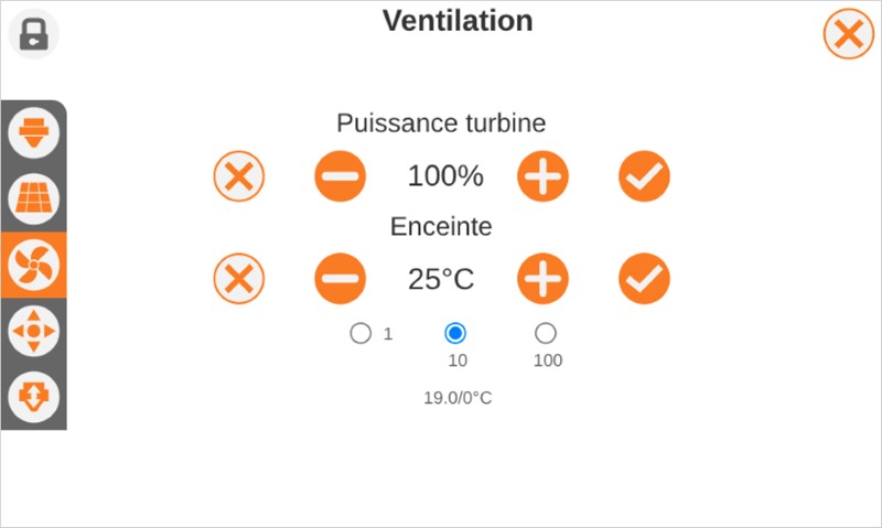 L’icône (X) ferme la fenêtre de contrôle du refroidissement, en conservant les dernières valeurs de consigne.