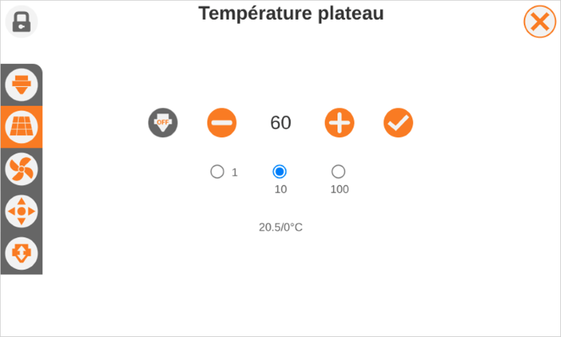 L’icône (X) ferme la fenêtre de contrôle de la température du plateau, en conservant la dernière température consigne.