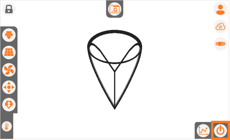 La fin d’une impression dépend de la séquence de fin du fichier .gcode : les éléments mobiles se déplacent pour libérer le volume d’impression ; les éléments mobiles et chauffants ne sont plus alimentés. Un appui sur l’icône (X) permet de quitter la fenêtre de fin d’impression.