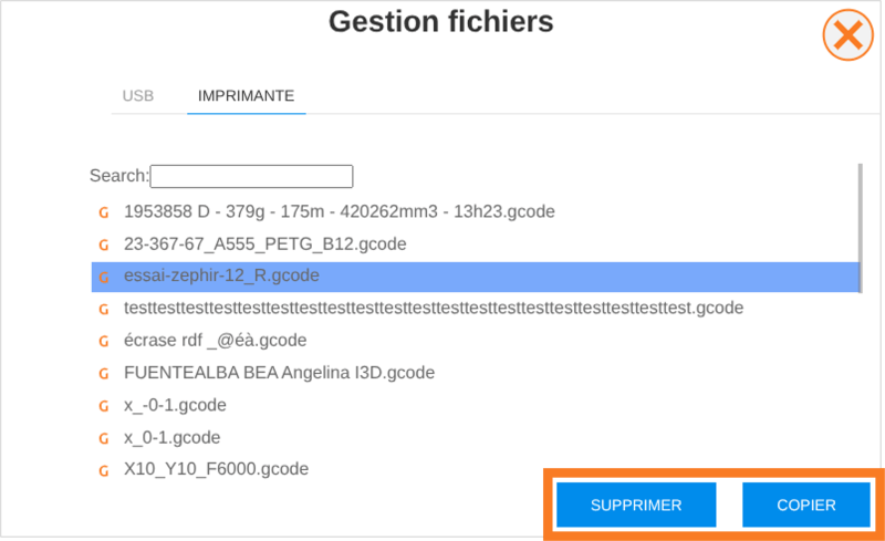 Cette fenêtre permet de gérer les fichiers .stl et .gcode de l’imprimante et de la clé USB :
