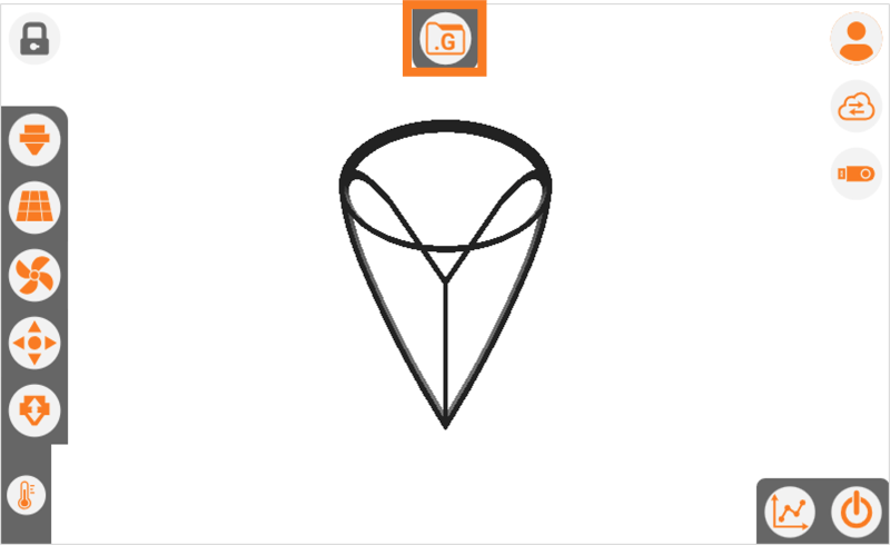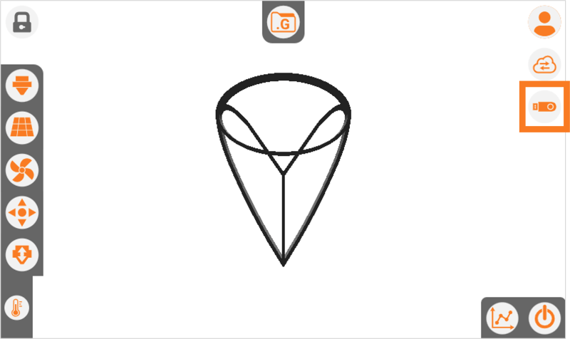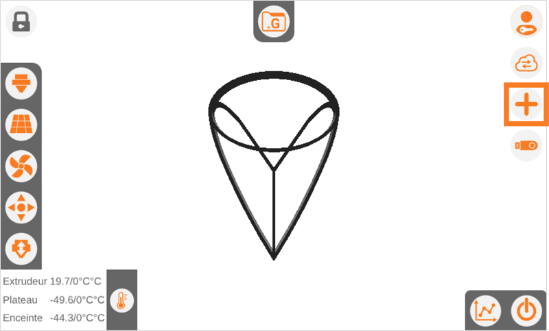 Ces onglets permettent d’accéder aux fichiers .gcode stockés sur la clé USB insérée ou stockés directement dans la mémoire de l’imprimante 3D.
