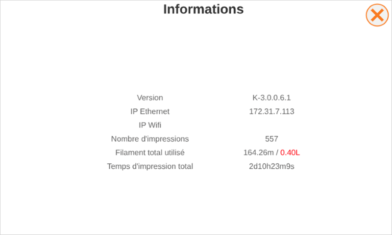 Cette fenêtre renvoie diverses informations sur l’imprimante 3D : version, IP Ethernet, IP WiFi, nombre d’impressions effectuées, filament total utilisé, temps d’impression total.