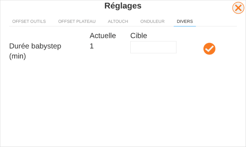 Cet onglet permet de régler la durée pendant laquelle la fonction Babystep est accessible au démarrage d’une impression (cf. Gérer l’écrasement de la 1ère couche).