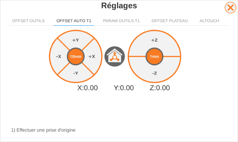 Les déplacements en X, Y et Z, ainsi que les changements d’outils, ne sont possibles qu’après avoir effectué une prise d’origine via l’icône (MAISON) sur les 3 axes (XYZ).