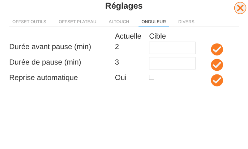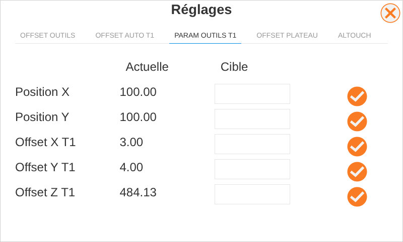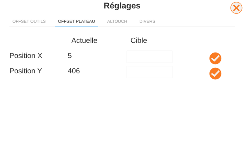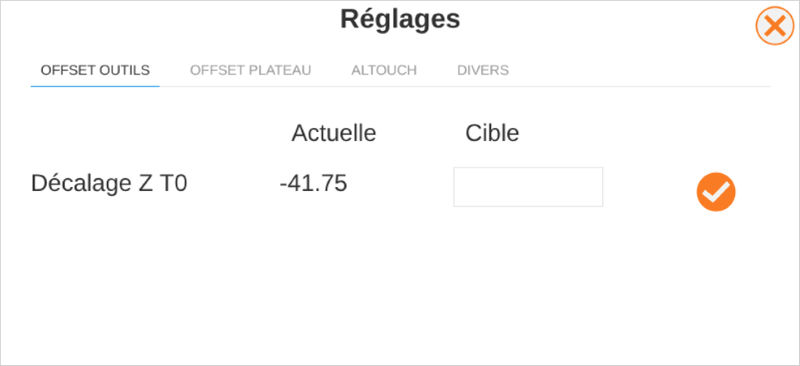 Pour modifier la valeur de décalage Z, appuyez sur le champ à éditer sous la colonne « Cible » : un pavé numérique s’affiche. Saisir la nouvelle valeur de décalage Z, puis validez. Vérifiez cette nouvelle valeur dans la colonne « Cible », par rapport à la colonne « Actuelle » ; si la valeur est correcte, validez-la en appuyant sur l’icône (V) et vérifiez que la valeur « Actuelle » a été mise à jour.