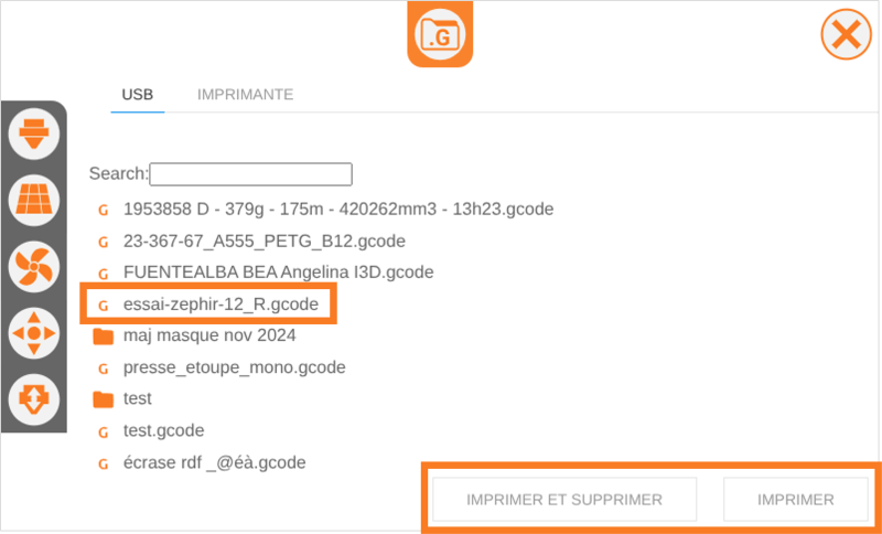 Un appui sur un fichier .gcode sélectionne ce fichier ; les boutons « IMPRIMER ET SUPPRIMER » et « IMPRIMER » deviennent accessibles.