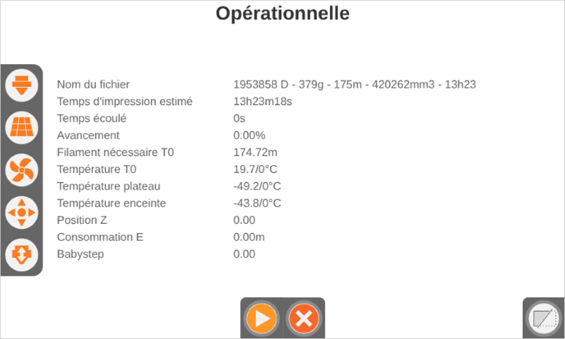 - Si le fichier .gcode provient de la clé USB, une phase d’analyse se lance durant laquelle des informations sont récupérées : longueur de filament nécessaire, durée estimée d’impression, etc. Pendant l’analyse, il est possible de contrôler les températures et déplacements de l’imprimante ou d’annuler l’impression (X). Une fois l’analyse terminée, vous pouvez démarrer l’impression en appuyant sur l’icone (PLAY).
