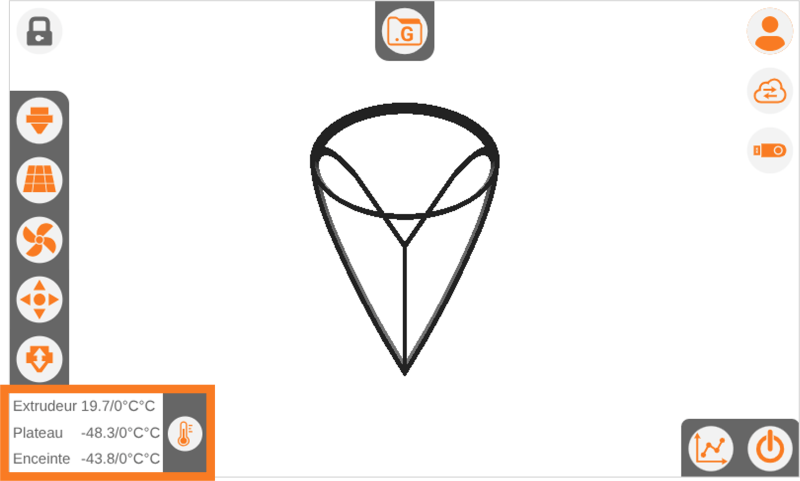L’icône (THERMOMETRE) permet de déployer et replier un volet de retour d’information sur les températures de consigne et mesurées des têtes d’impression, du plateau et de l’enceinte.