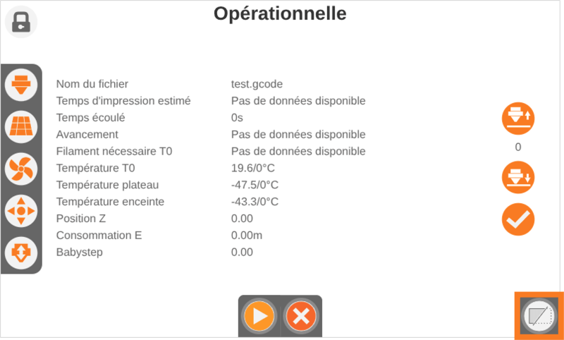 - Si le fichier .gcode provient de la mémoire de l’imprimante, l’analyse a déjà été effectuée et le lancement de l’impression est immédiatement possible via l’icône (PLAY).