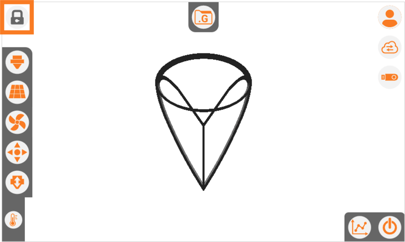 Il est possible d’accéder au volume d’impression grâce à un appui sur l’icone (CADENAS) : l’imprimante exécute les quelques commandes qu’elle a en mémoire et abaisse le pêne, libérant ainsi les portes du volume d’impression. Le verrou se referme automatiquement après quelques secondes.