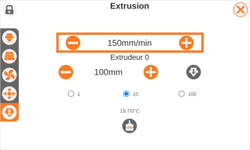 En mode « administrateur », sur la fenêtre Extrusion, en plus de la longueur et de la température d’extrusion paramétrable en mode « opérateur », il est possible de gérer la vitesse d’extrusion (en mm/min), afin de tester l’extrusion